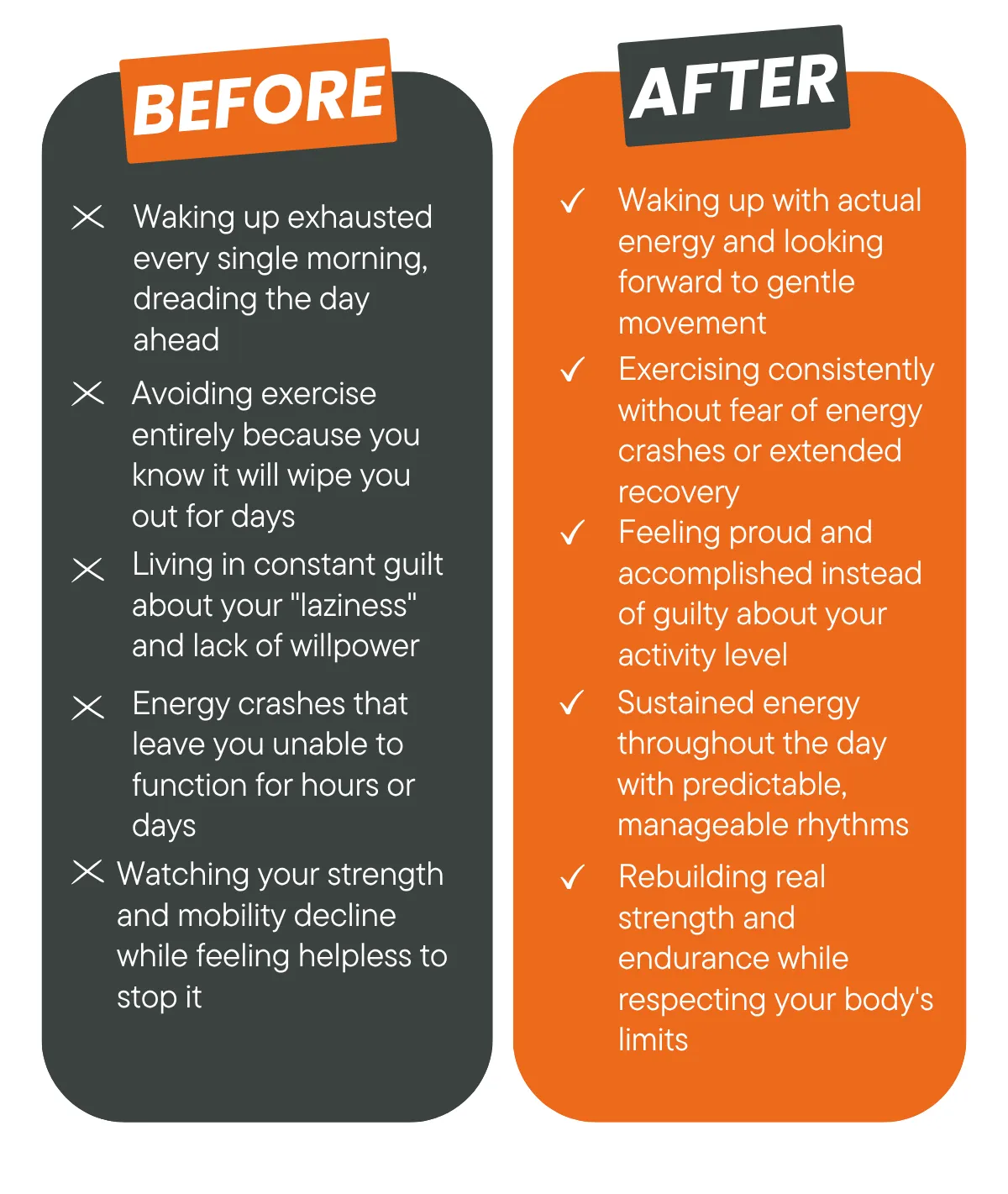 Traditional workouts often drain energy and trigger crashes for people with fatigue. This system focuses on energy pacing, adaptive movement, and strategic rest, so you can exercise consistently without feeling worse afterward.